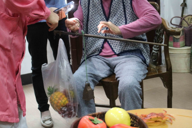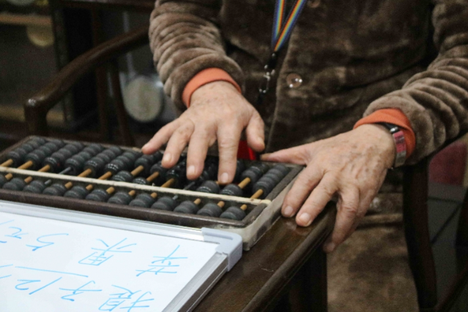 “葡萄12元一斤,买2斤,一共多少钱?”“22元。”“那2×2等于多少呢?”“等于4。”“那你再算算葡萄多少钱?”随着拨弄算盘的声音落下,老人缓缓地说:“24元。”在一间布置着黑白电视机、斗笠、草帽的房间里,三名老人在护理员的引导下,模拟买水果,用算盘结账的是刚入院的梁文华(化名)。